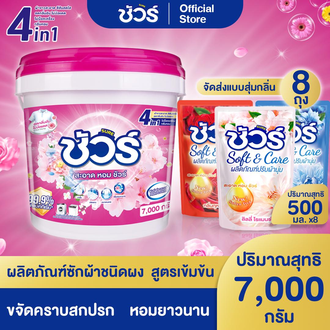 ชัวร์ SURE ถังใหญ่ ผงซักฟอก 7000 กรัม พร้อมน้ำยาปรับผ้านุ่ม 500ml*8 สำหรับผ้าขาวและสี ต้านเชื้อแบคทีเรีย ไม่ทำร้ายมือ ผลิตในไทย